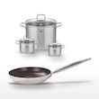 - COMPOSITION : COMPOSITION : La poêle est en aluminium et inox avec revêtement céramique. Les faitouts sont en acier inoxydable avec couvercles en verre.