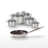 - COMPOSITION : COMPOSITION : Poêle en aluminium et inox, faitouts en acier inoxydable. Revêtement céramique sans PFAS.