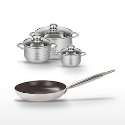 DESCRIPTION : DESCRIPTION : Ce lot Elo inclut une poêle 32 cm en céramique et trois faitouts en inox, parfaits pour une cuisson saine et uniforme.PETIT + : PETIT + : La poêle dispose d'un revêtement ELODUR® Select, antiadhésif et résistant aux rayures, facile à nettoyer.COMPOSITION : COMPOSITION : P