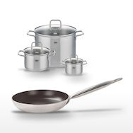 - COMPOSITION : COMPOSITION : Poêle en aluminium et inox avec revêtement céramique, faitouts en acier inoxydable avec couvercles en verre.
