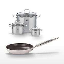 DESCRIPTION : DESCRIPTION : L'ensemble Elo propose une poêle de 32 cm avec revêtement céramique sans PFAS et trois faitouts en inox, offrant une polyvalence et une qualité de cuisson exceptionnelles.PETIT + : PETIT + : La poêle Elo Bistro Line est dotée d'un revêtement antiadhésif résistant aux rayu