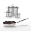 - COMPOSITION : COMPOSITION : Aluminium et inox pour la poêle, acier inoxydable et verre pour les faitouts, garantissant robustesse et élégance.
