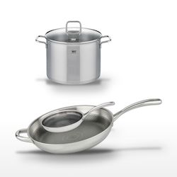 - COMPOSITION : Acier inoxydable 18/10 avec revêtement antiadhésif pour les poêles, et acier inoxydable avec couvercle en verre pour le faitout.