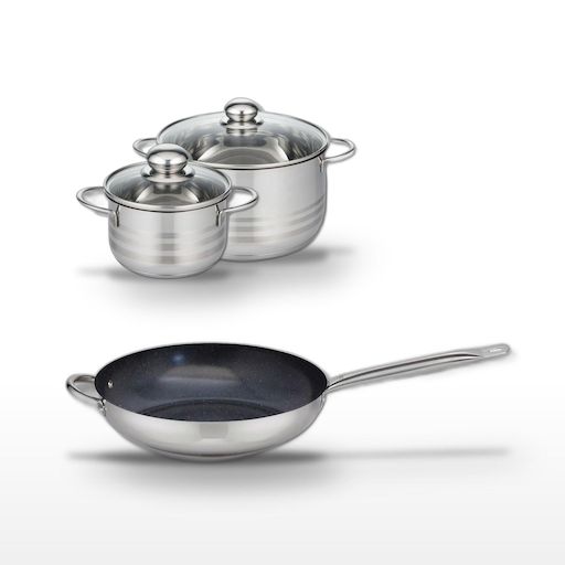 - COMPOSITION : COMPOSITION : Poêle en acier inoxydable avec revêtement ELODUR® et faitouts en inox de haute qualité, tous garantis sans PFAS.