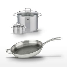 L'ensemble Elo Relief Evolution est conçu pour répondre aux besoins des professionnels de la cuisine. La poêle de 32 cm offre une cuisson précise grâce à sa technologie Triply et son revêtement antiadhésif ELODUR® Professional, garantissant une résistance aux rayures et une cuisson sans matières grasses. Les faitouts de 26 cm et 16 cm, fabriqués en acier inoxydable, sont idéaux pour préparer des plats mijotés tout en conservant les nutriments essentiels. Chaque pièce de cet ensemble est compatible avec tous les types de feux, y compris l'induction, et est facile à entretenir. Ce lot est un investissement durable pour les cuisines professionnelles, assurant efficacité et qualité à chaque utilisation.
