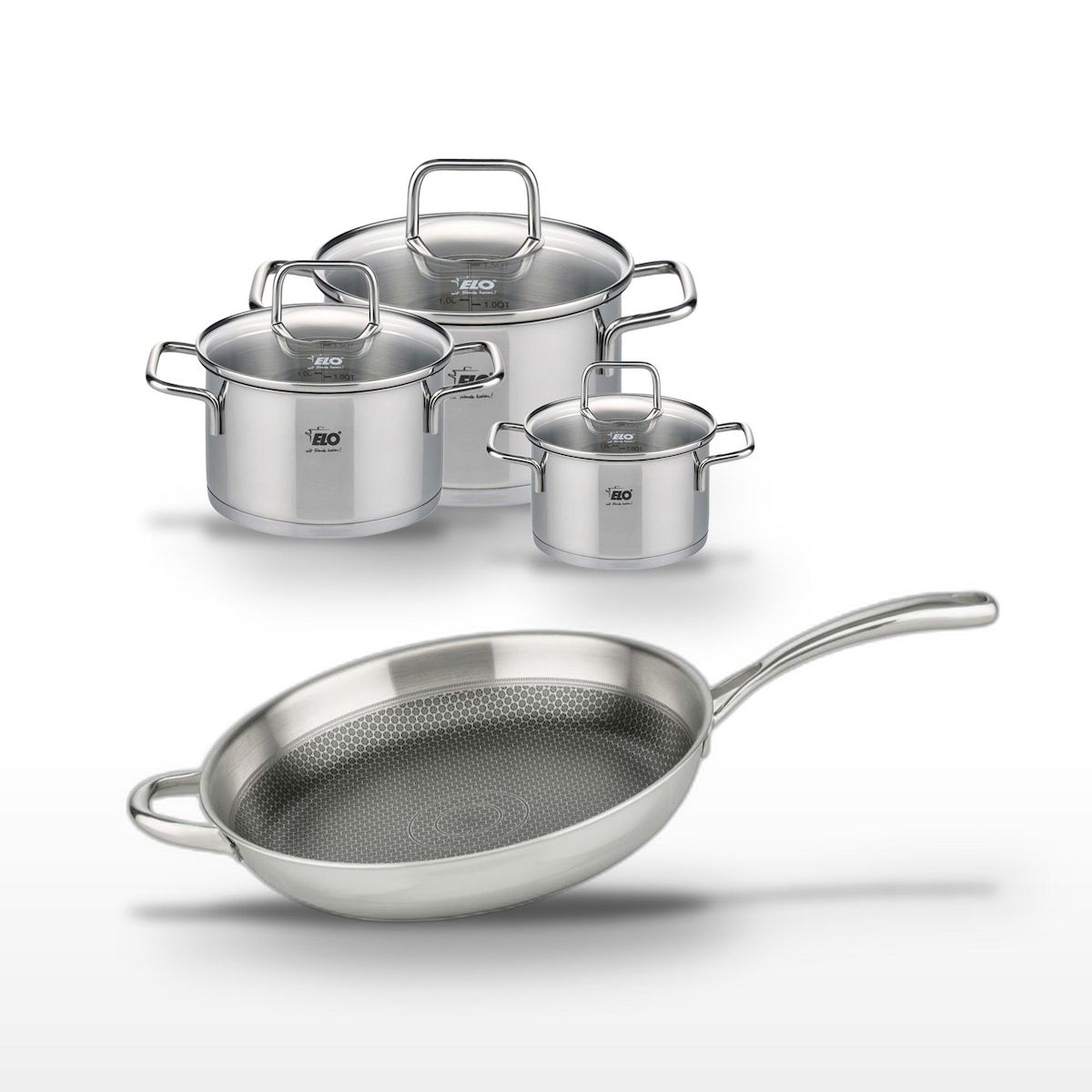 - DESCRIPTION : DESCRIPTION : Ensemble Elo comprenant une poêle 32 cm en inox 18/10 et trois faitouts en inox de tailles variées, idéal pour des cuissons homogènes.