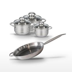 - DESCRIPTION : Ce lot comprend une poêle 32 cm et trois faitouts de 12, 14 et 16 cm, tous en acier inoxydable sans PFAS, offrant une cuisson homogène et saine.