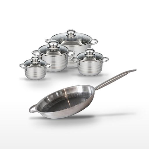 - DESCRIPTION : L'ensemble Elo Relief Solution inclut une poêle 32 cm et quatre faitouts en acier inoxydable, offrant une cuisson homogène et sans PFAS.