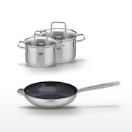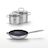 - COMPOSITION : Poêle en acier inoxydable avec revêtement sans PFAS, faitouts en inox avec couvercles en verre.