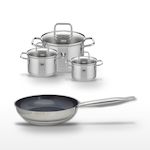 - COMPOSITION : Fabriqué en acier inoxydable de haute qualité avec un revêtement céramique sans PFAS pour la poêle et des couvercles en verre pour les faitouts.