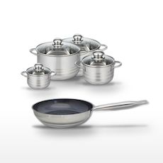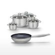 - COMPOSITION : COMPOSITION : Poêle en acier inoxydable avec revêtement ELODUR®, faitouts en inox de haute qualité avec couvercles en verre.