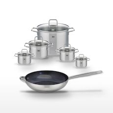 - COMPOSITION : COMPOSITION : Poêle en acier inoxydable avec revêtement sans PFAS et faitouts en inox avec couvercles en verre.