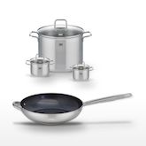 - COMPOSITION : Poêle en acier inoxydable 18/10 avec revêtement sans PFAS, faitouts en inox avec couvercles en verre.