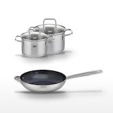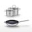 - COMPOSITION : Poêle en acier inoxydable avec revêtement sans PFAS, faitouts en inox avec couvercles en verre.