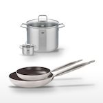 - COMPOSITION : COMPOSITION : Aluminium et inox pour les poêles, acier inoxydable et verre pour les faitouts, garantissant robustesse et résistance à la chaleur.
