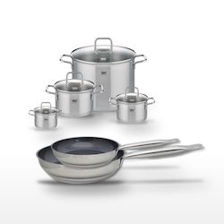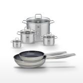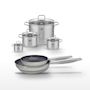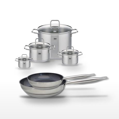 - COMPOSITION : Poêles en acier inoxydable avec revêtement ELODUR® Professional et faitouts en inox avec couvercles en verre.