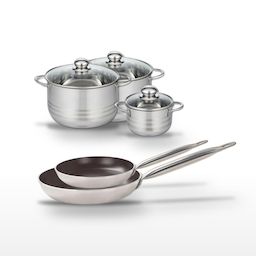 - COMPOSITION : COMPOSITION : Poêles en aluminium avec poignée en inox et revêtement céramique sans PFAS. Faitouts en acier inoxydable de haute qualité avec couvercles en verre.