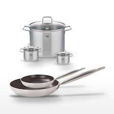 - COMPOSITION : COMPOSITION : Poêles en aluminium avec revêtement céramique sans PFAS, faitouts en acier inoxydable et couvercles en verre.