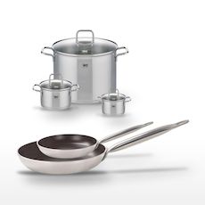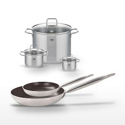 - COMPOSITION : COMPOSITION : Poêles en aluminium avec revêtement céramique, faitouts en acier inoxydable avec couvercles en verre. Tous garantis sans PFAS.