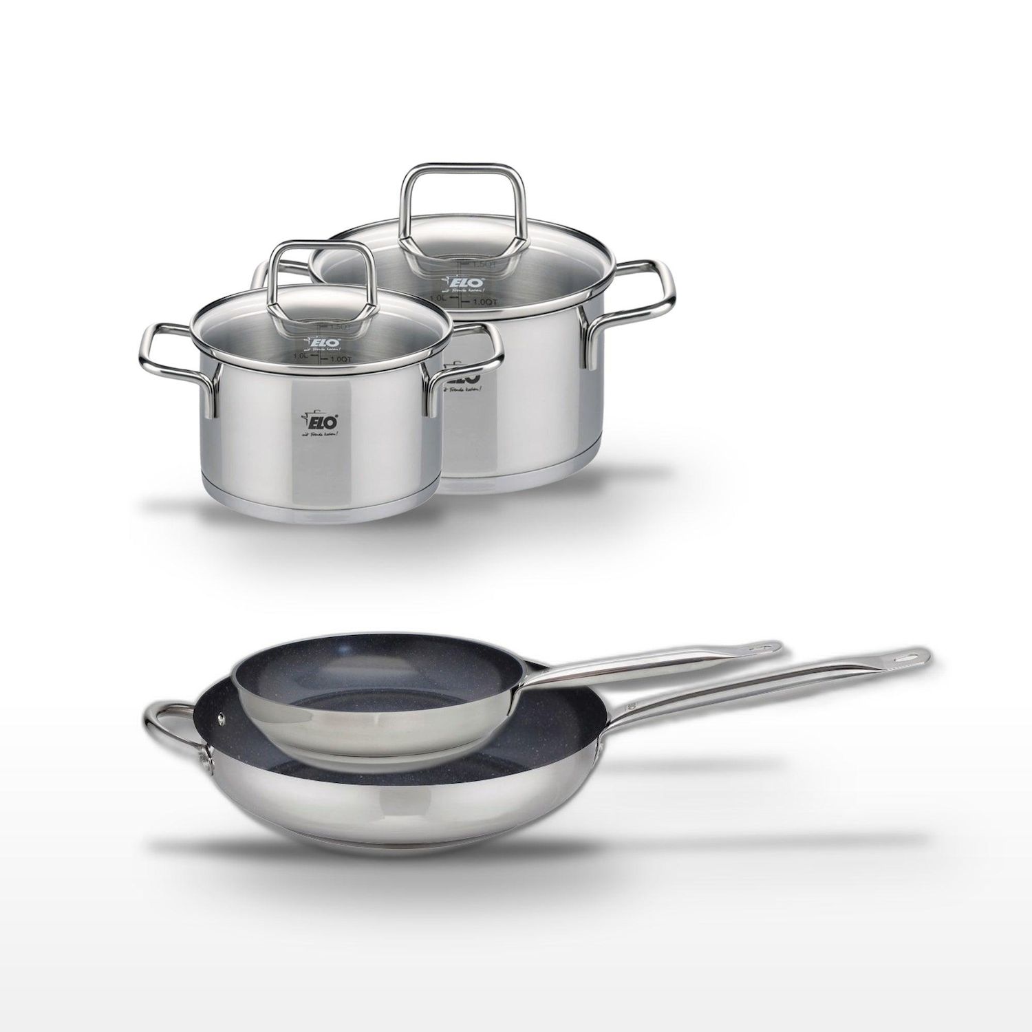 - DESCRIPTION : DESCRIPTION : Ce lot Elo comprend deux poêles céramiques sans PFAS et deux faitouts en inox, offrant une cuisson saine et homogène.