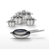 - COMPOSITION : COMPOSITION : Poêles en acier inoxydable 18/10 avec revêtement sans PFAS, faitouts en inox de haute qualité avec couvercles en verre résistants.