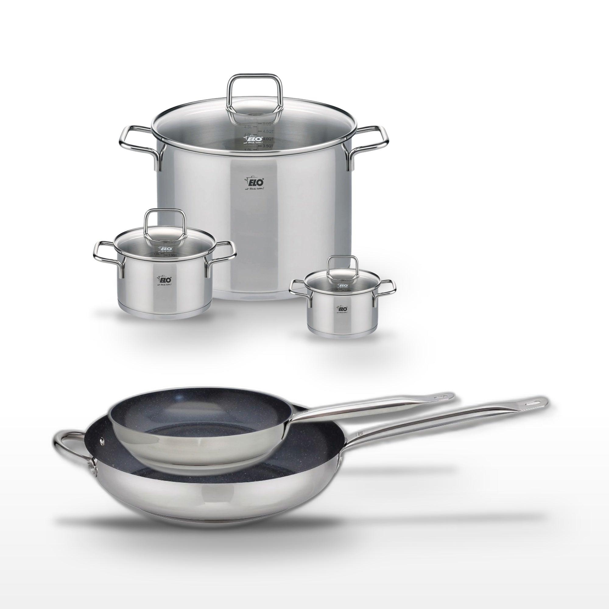 - DESCRIPTION : L'ensemble Elo offre deux poêles céramique sans PFAS et trois faitouts en inox pour une cuisine saine et efficace.