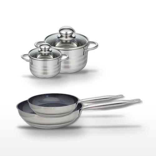 - COMPOSITION : COMPOSITION : Poêles en acier inoxydable 18/10 avec revêtement sans PFAS. Faitouts en inox de haute qualité.