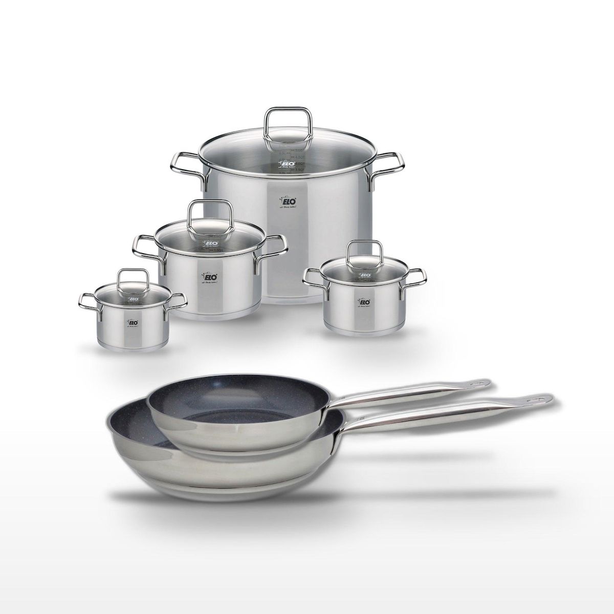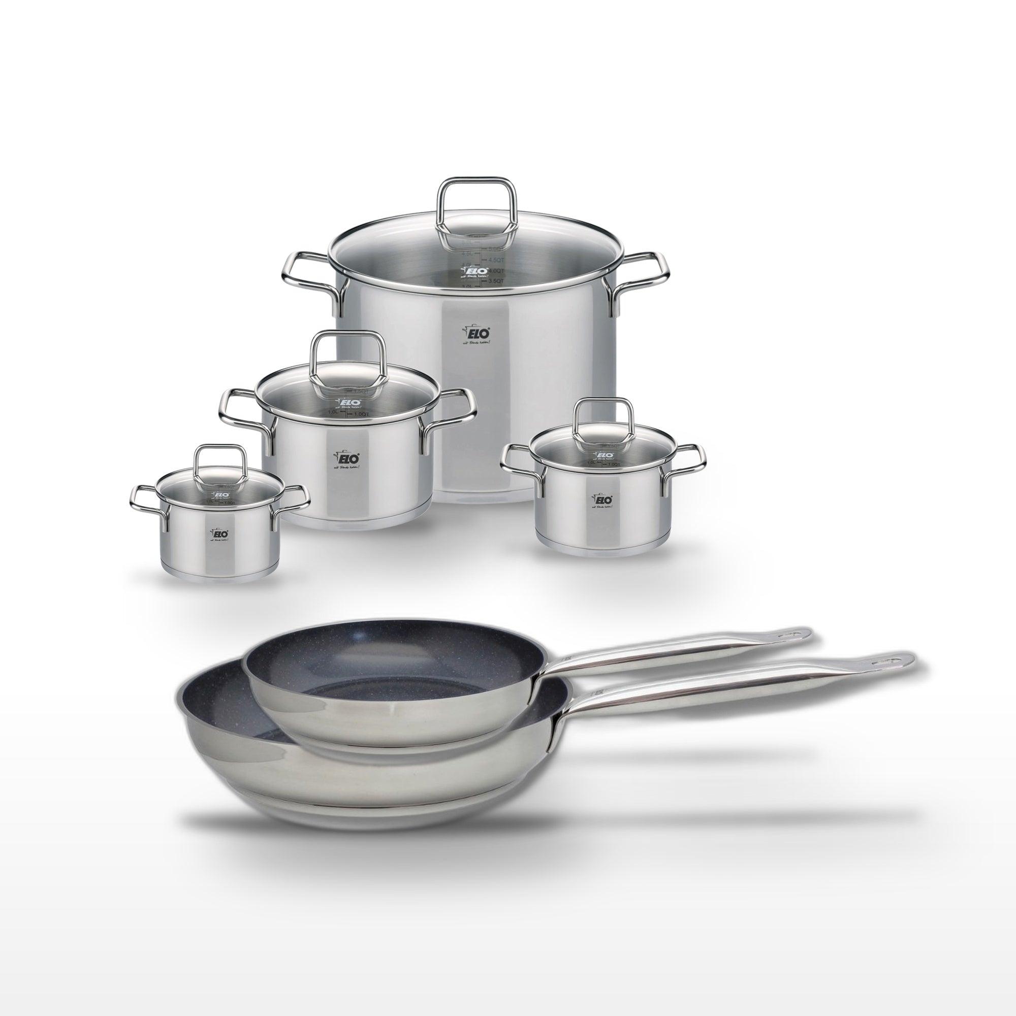 Lot Poêles 24cm & 28cm Elo Profi Therm Platinum et 4 Faitouts Elo Citrin