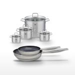 - COMPOSITION : Poêles en acier inoxydable avec revêtement sans PFAS, faitouts en inox avec couvercles en verre.