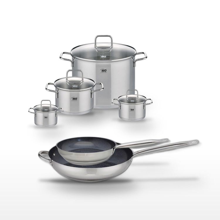 - DESCRIPTION : Ce lot Elo propose deux poêles en acier inoxydable avec revêtement sans PFAS pour une cuisson saine, et quatre faitouts en acier inoxydable pour une cuisson polyvalente.