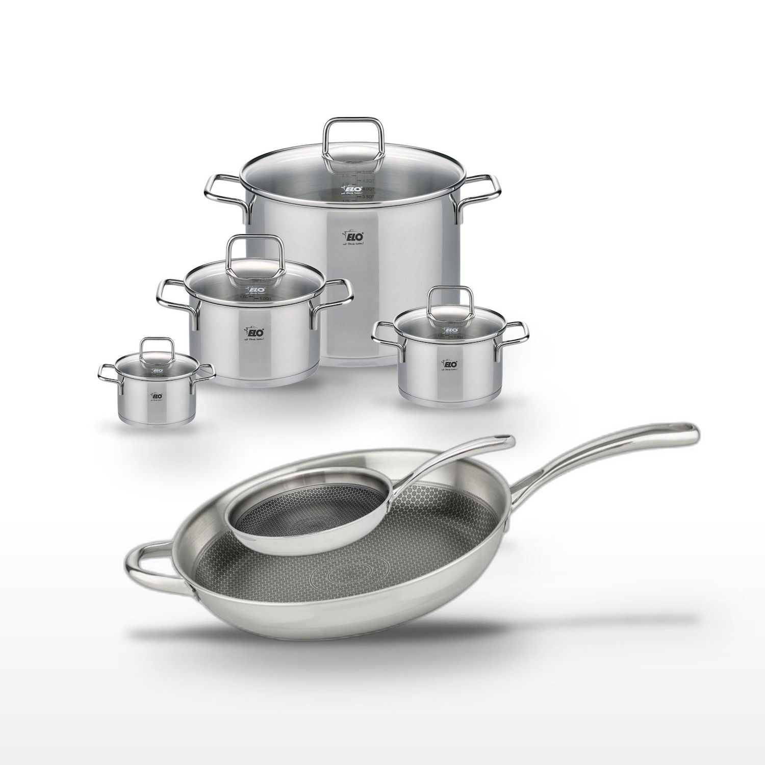 - DESCRIPTION : Ce lot Elo comprend deux poêles en inox 18/10 avec revêtement antiadhésif et quatre faitouts en inox. Idéal pour une cuisine variée et saine.