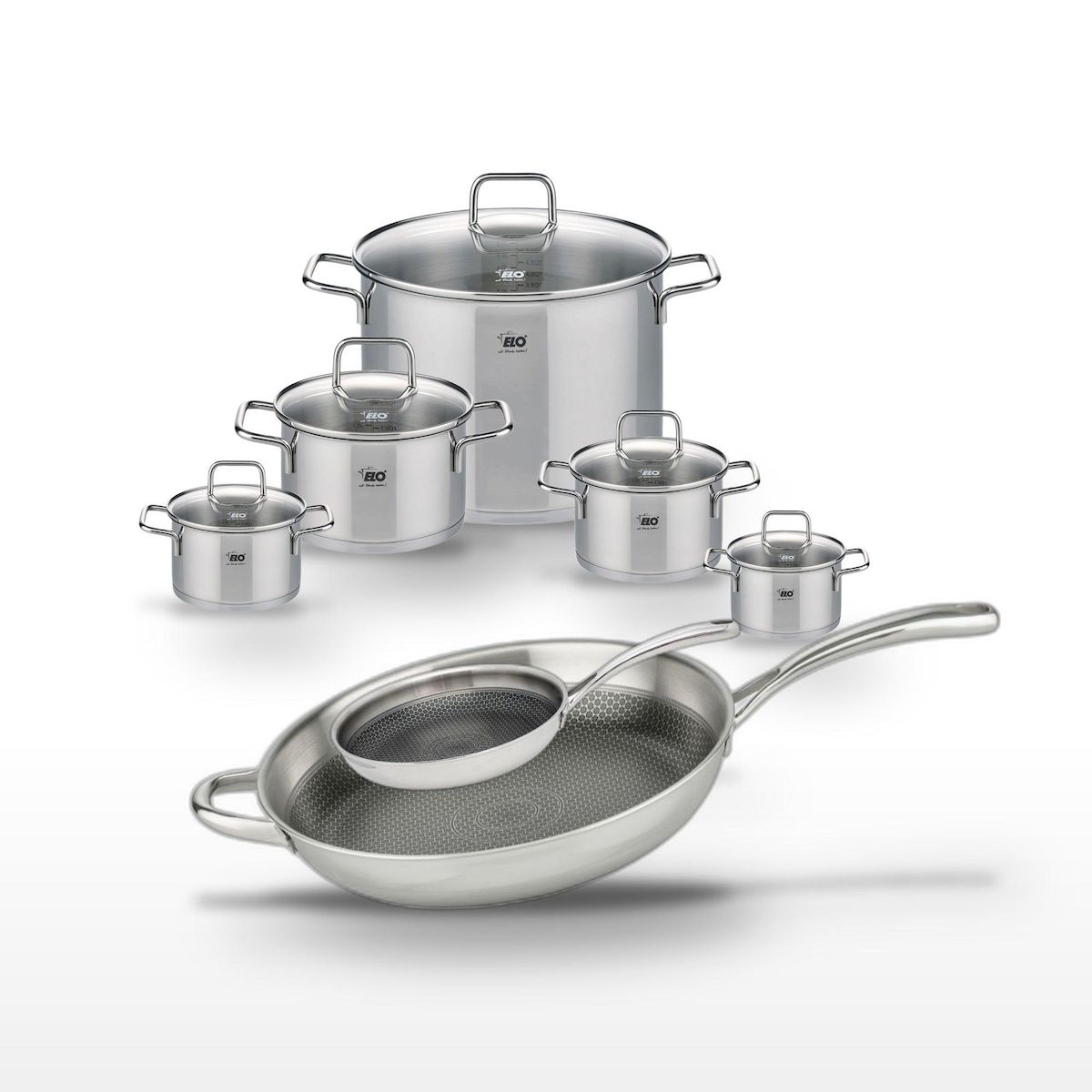 - DESCRIPTION : Cet ensemble Elo comprend des poêles et faitouts en acier inoxydable, offrant une cuisson homogène et saine grâce à leur revêtement antiadhésif et leur fond capsulé.