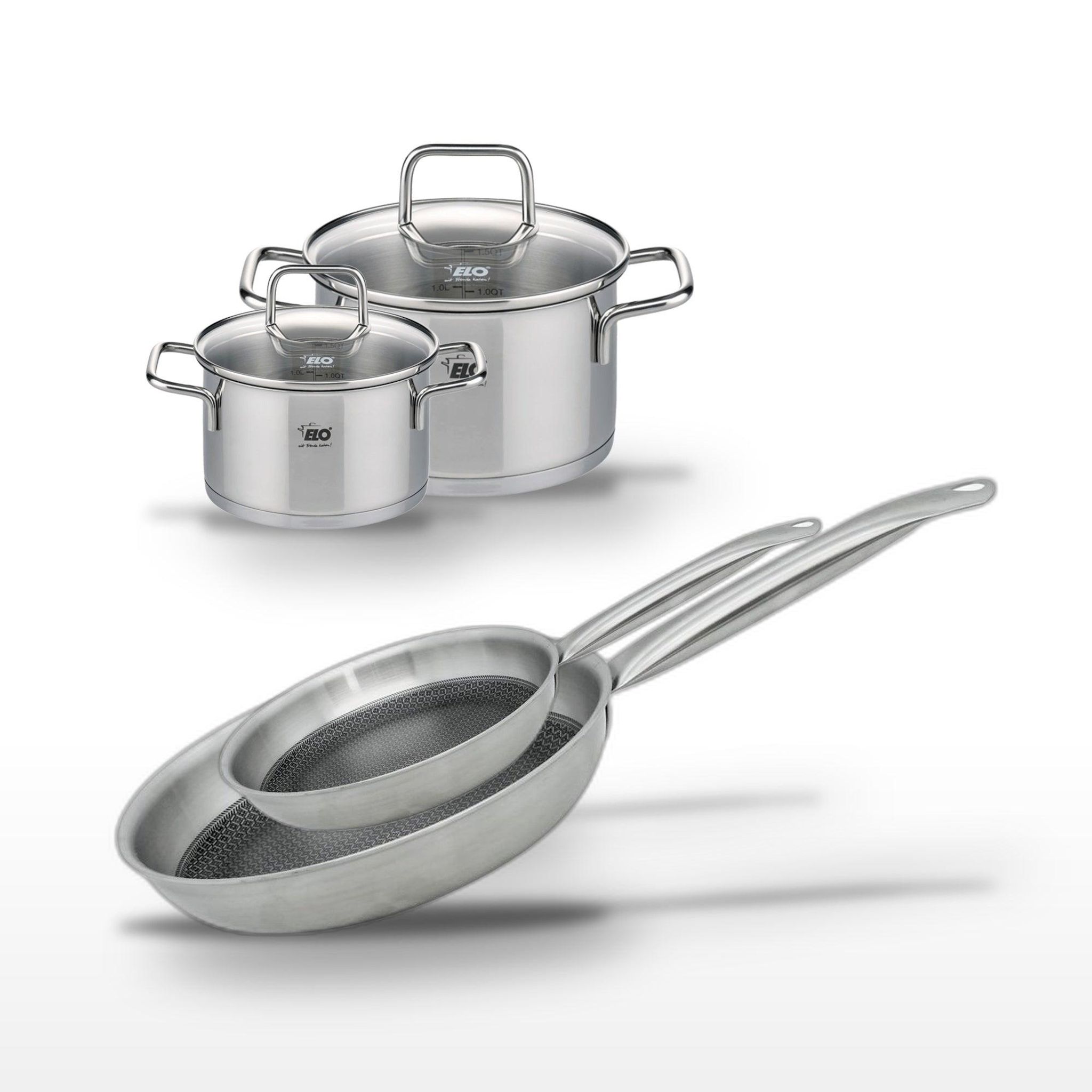 - DESCRIPTION : DESCRIPTION : Le lot Elo Relief Solution inclut deux poêles en acier inoxydable 18/10 de 28 cm et 24 cm, et deux faitouts de 16 cm et 12 cm, alliant design moderne et fonctionnalité.