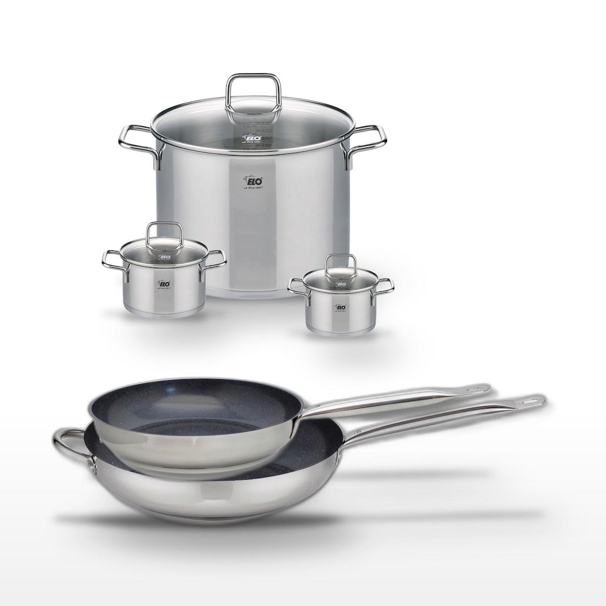 - DESCRIPTION : DESCRIPTION : Ce lot Elo allie innovation et qualité avec deux poêles céramique sans PFAS et trois faitouts en acier inoxydable, parfaits pour une cuisine saine et efficace.
