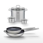 - COMPOSITION : COMPOSITION : Poêles en acier inoxydable 18/10 avec revêtement sans PFAS, faitouts en acier inoxydable avec couvercles en verre.