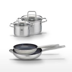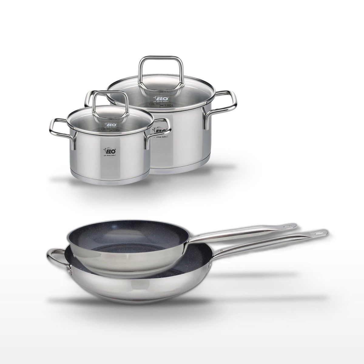 - DESCRIPTION : Ce lot Elo comprend deux poêles en céramique sans PFAS (28 cm et 32 cm) et deux faitouts en inox (16 cm et 20 cm), idéaux pour une cuisine saine et polyvalente.