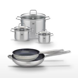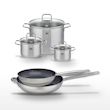 - COMPOSITION : Poêles en acier inoxydable 18/10 avec revêtement sans PFAS, faitouts en inox avec couvercles en verre. Matériaux robustes et esthétiques.
