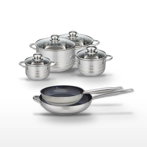 - COMPOSITION : COMPOSITION : Poêles en acier inoxydable avec revêtement céramique, faitouts en inox de haute qualité, tous garantis sans PFAS.