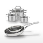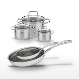 - COMPOSITION : Poêles en acier inoxydable 18/10 avec revêtement ELODUR® et faitouts en acier inoxydable avec couvercle en verre. Structure Triply pour une répartition uniforme de la chaleur.