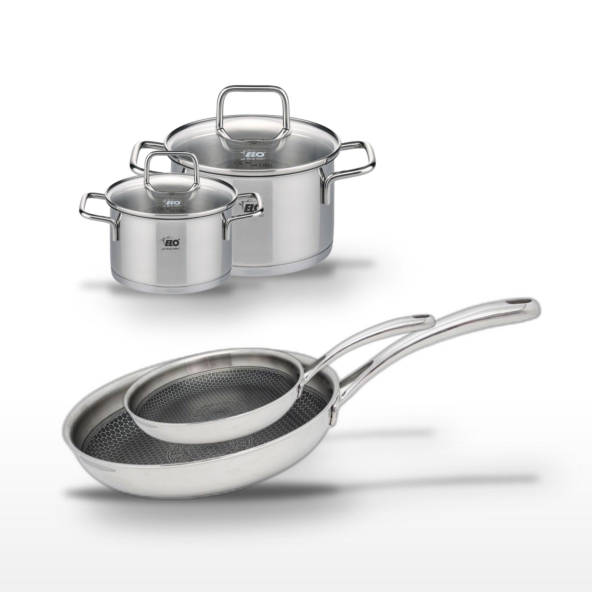 - DESCRIPTION : DESCRIPTION : Ensemble de poêles et faitouts Elo en inox pour une cuisine saine et efficace. Les poêles sont dotées d'un revêtement antiadhésif sans PFAS.