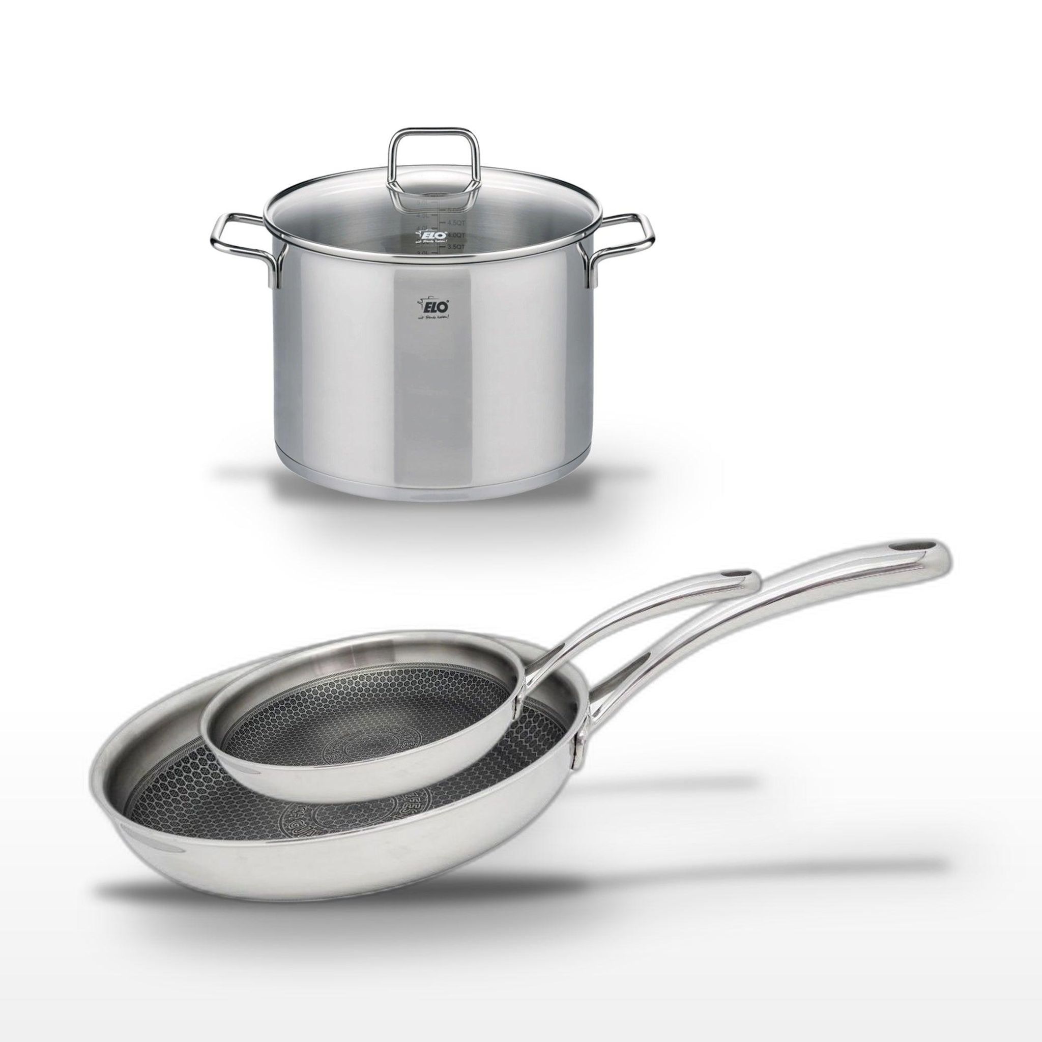 - DESCRIPTION : Ce lot Elo comprend deux poêles de 28 cm et 24 cm, ainsi qu'un faitout de 26 cm. Conçus en inox 18/10, ces ustensiles offrent une cuisson homogène et sans attache grâce à leur revêtement antiadhésif.