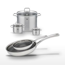 - COMPOSITION : Acier inoxydable 18/10 pour les poêles, et acier inoxydable avec couvercles en verre pour les faitouts.