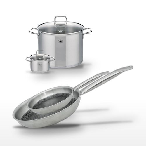 - DESCRIPTION : DESCRIPTION : L'ensemble Elo Relief Solution inclut deux poêles (28 cm et 24 cm) et deux faitouts (26 cm et 14 cm), tous en acier inoxydable 18/10, pour une cuisine variée et efficace.