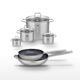 - COMPOSITION : COMPOSITION : Poêles en acier inoxydable avec revêtement sans PFAS et faitouts en inox avec couvercles en verre.