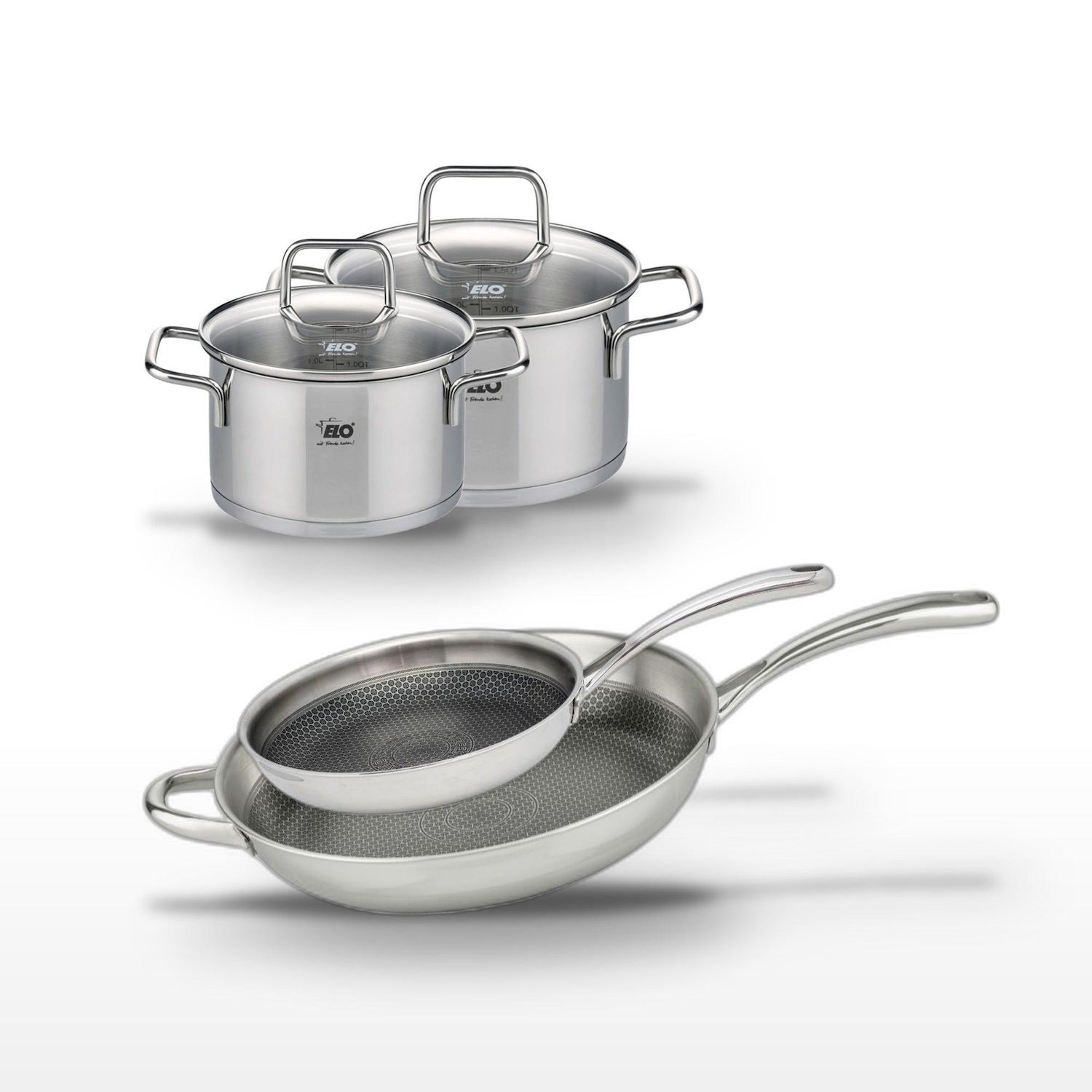 - DESCRIPTION : Ce lot Elo combine deux poêles en inox de haute technologie et deux faitouts pratiques. Idéal pour une cuisson saine et homogène grâce au revêtement antiadhésif ELODUR®.