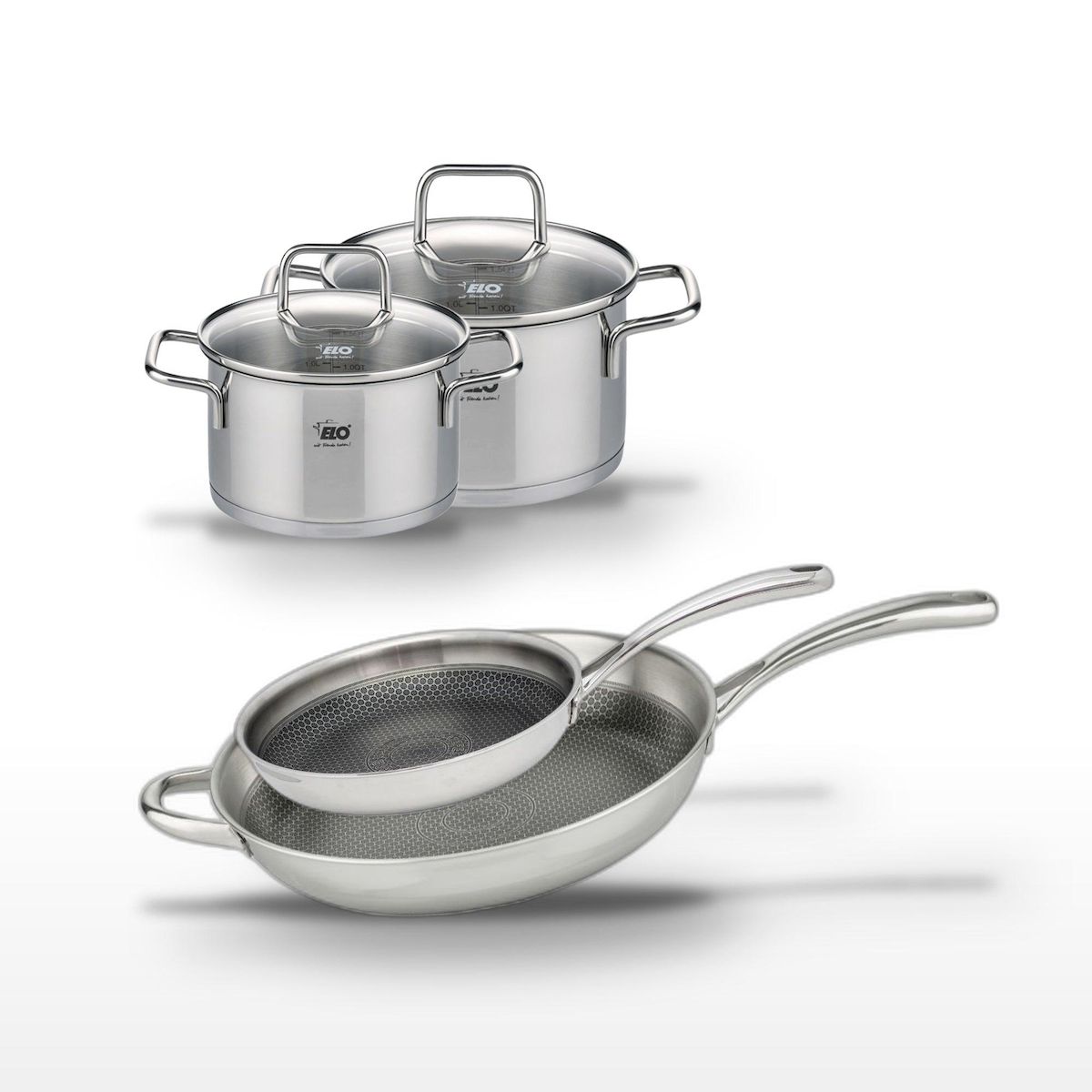 - DESCRIPTION : L'ensemble Elo Relief Evolution inclut deux poêles en inox de 28 cm et 32 cm, parfaites pour saisir et cuire uniformément, et deux faitouts compacts pour des préparations variées.