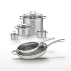 - COMPOSITION : Acier inoxydable 18/10 pour les poêles, acier inoxydable et verre pour les faitouts. Structure Triply pour une répartition uniforme de la chaleur.