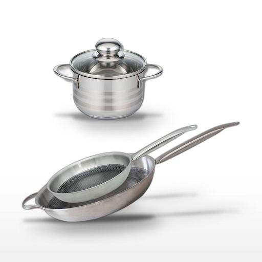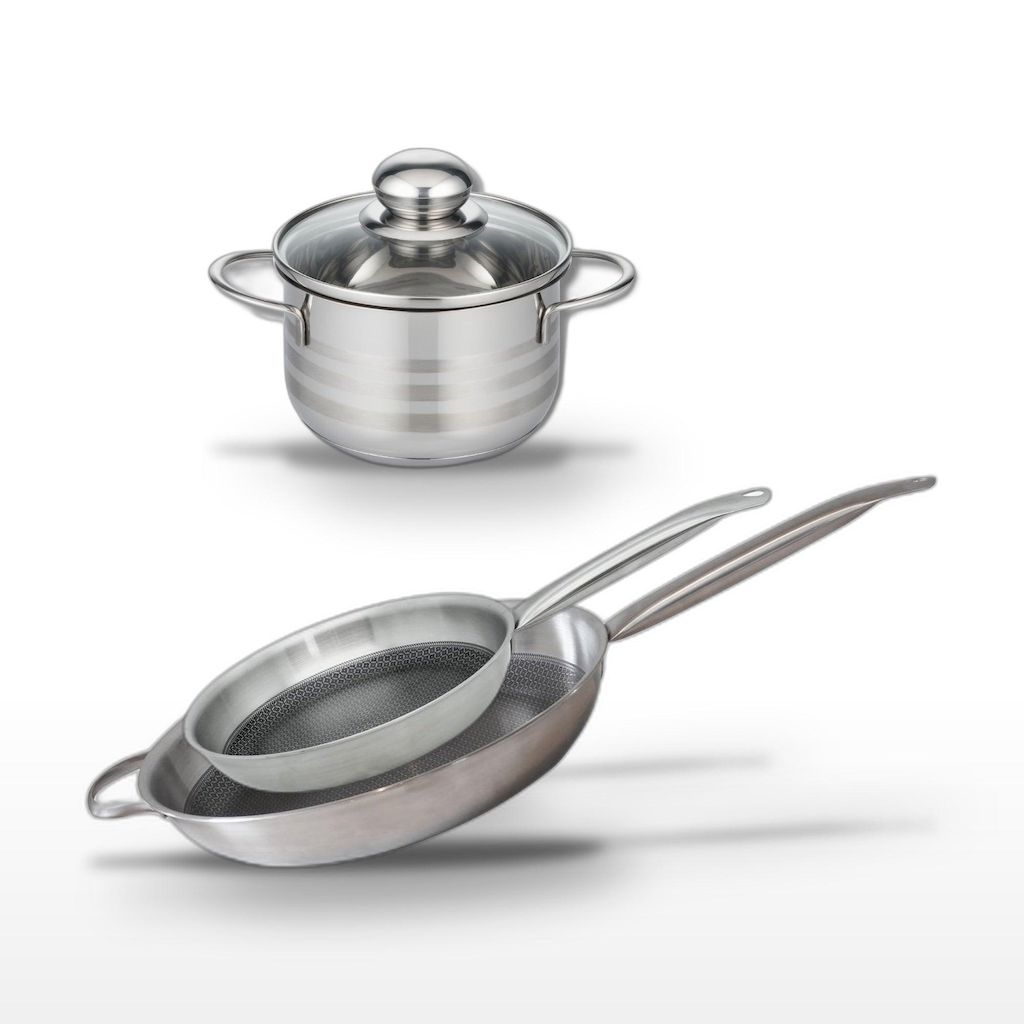 - DESCRIPTION : Lot Elo Relief Solution avec deux poêles en acier inoxydable 18/10 et un faitout. Profitez d'une cuisson homogène et d'une durabilité exceptionnelle.