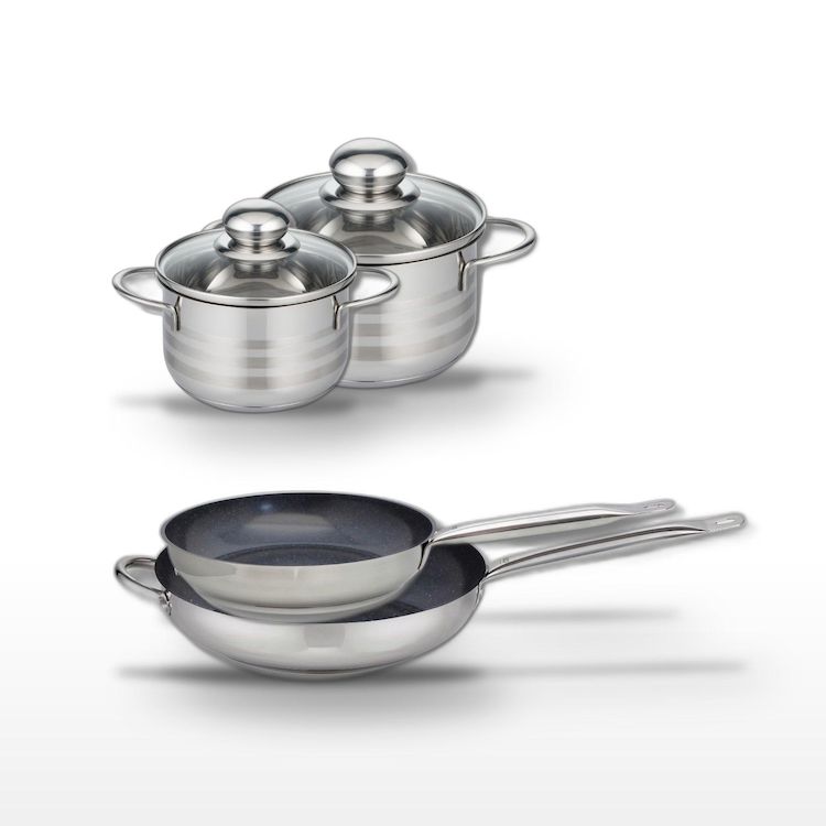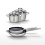 - COMPOSITION : COMPOSITION : Poêles en acier inoxydable 18/10 avec revêtement céramique sans PFAS, faitouts en inox résistant à la chaleur jusqu'à 240°C.