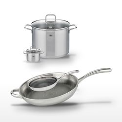 - COMPOSITION : COMPOSITION : Poêles et faitouts en acier inoxydable 18/10, revêtement ELODUR® Professional pour les poêles, couvercles en verre pour les faitouts, garantissant robustesse et efficacité.